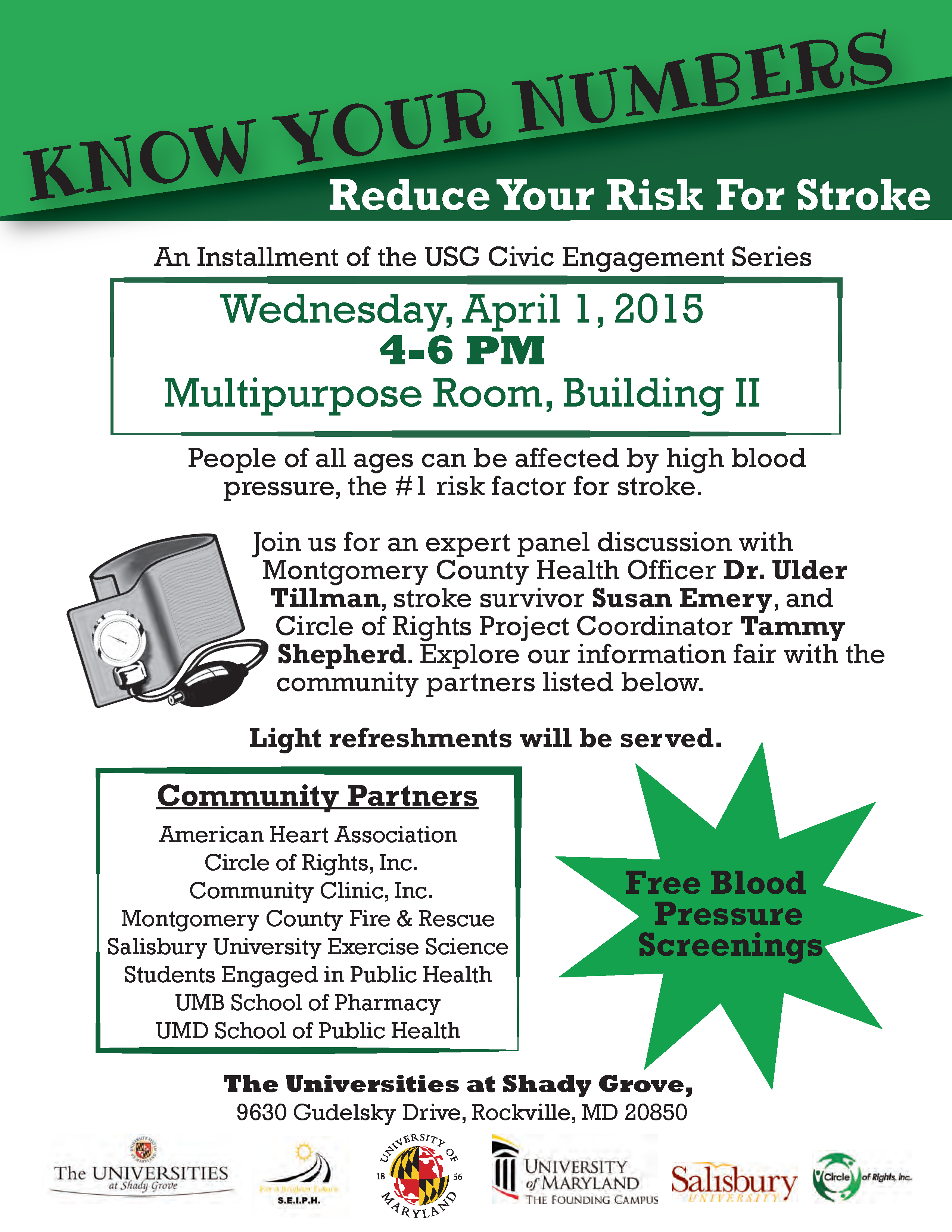 The event will feature an expert panel, information booths, free blood pressure screenings, and free food! Our experts are Dr. Ulder Tillman of the Montgomery County Health Department, Dr. Rebecca Fitch of Kaiser Permanente, and Susan Emery and Tammy Shepherd from Circle of Rights, Inc. We’ll also have representatives from the American Heart Association, Community Clinic Inc., Salisbury University Exercise Science, UMB School of Pharmacy, and UMD School of Public Health. This event is open to everyone, so we hope to see you there! Click here to see our Facebook event.