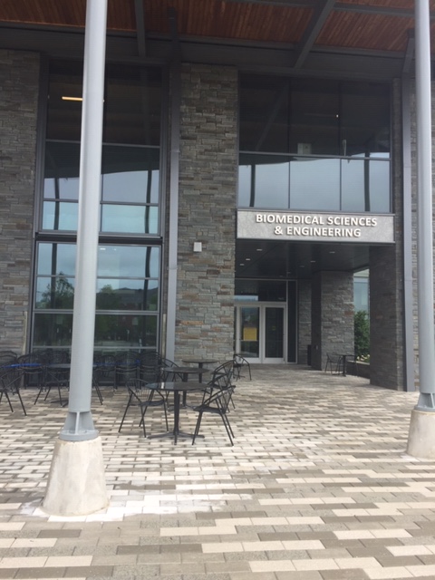 A gray stone building surrounded by a gray brick walkway, black chairs, and round, black tables. The entry reads, "Biomedical Sciences and Engineering."
