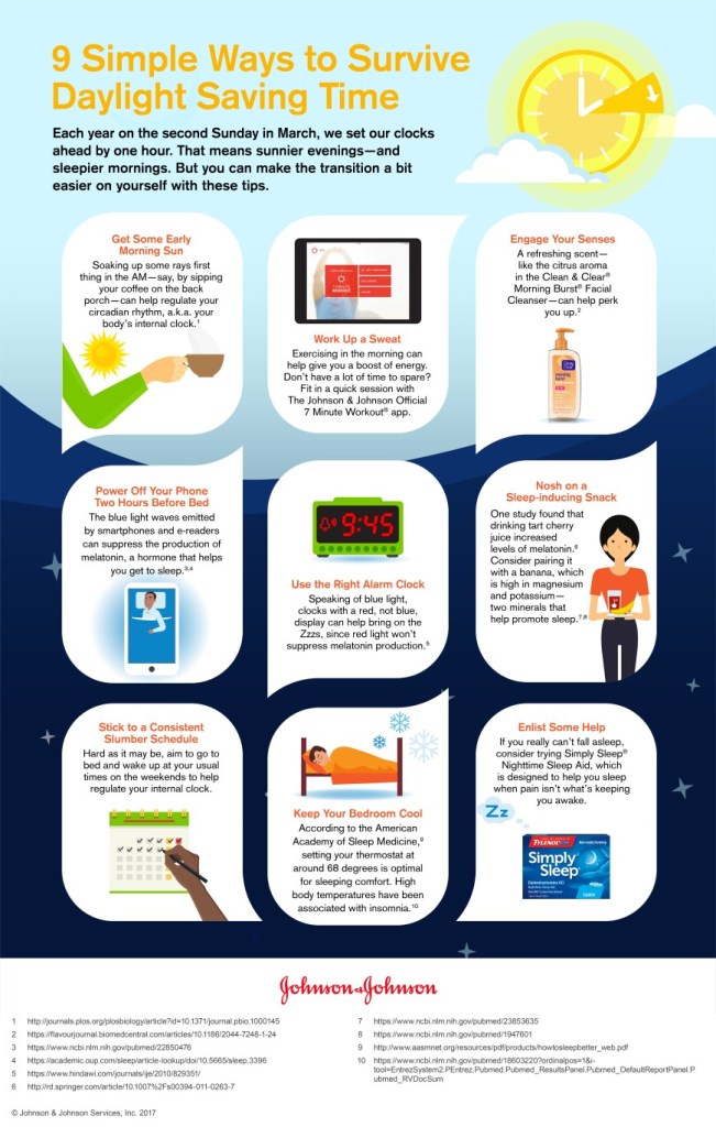 Once again, I believe the true solution is to catch up to states like Hawaii and Arizona and get rid of daylight saving time altogether. But, unfortunately it seems like this regular time change is sticking around, so if you’re like me and struggling to stay awake on Monday morning, here are a few survival tips from Johnson and Johnson: