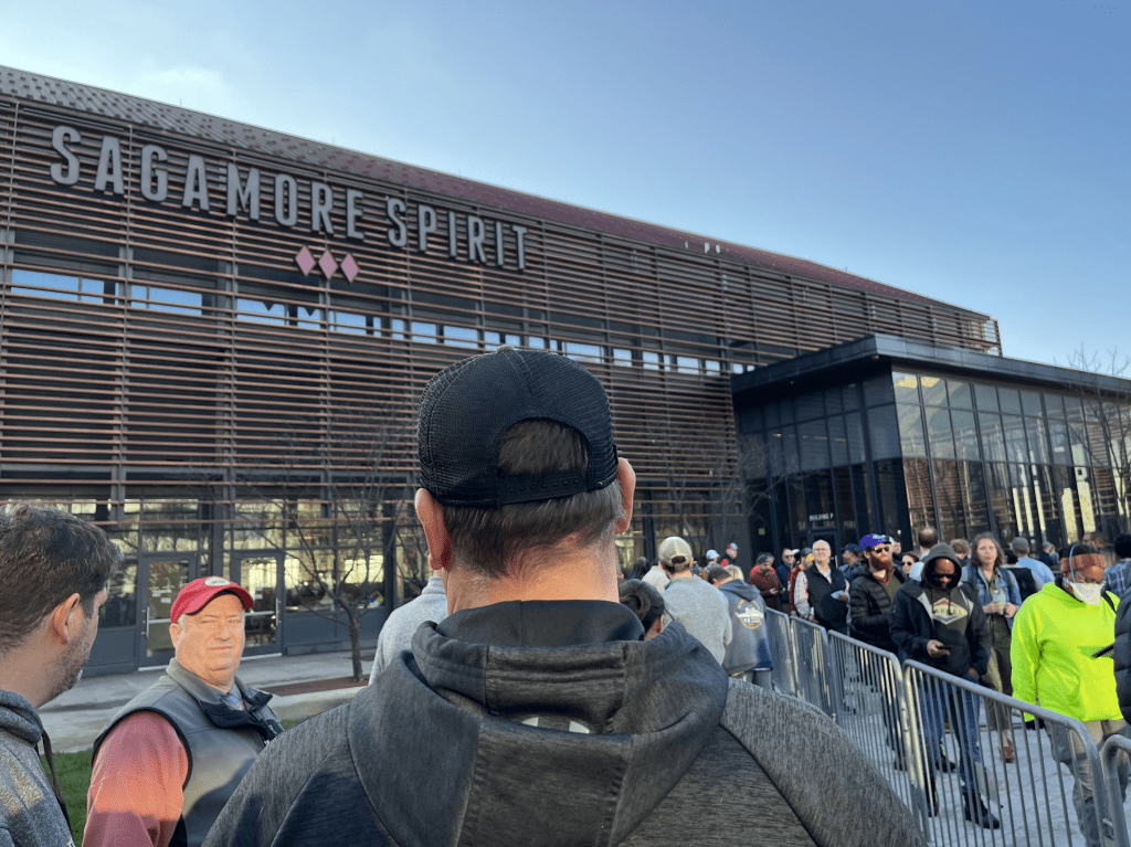 We stood in line for hours; three to be exact. Word whispered through the crowd that the man at the front of the line had gotten to the distillery at 8pm the night before, and slept in the rain in his lawn chair while waiting for the event to begin at 7:30 am the next day. All of us in line looked sleep deprived, and yet it was the jolliest crowd I had been in since covid. With coffee cups in hand, everyone was eager to make friends with their fellow early-bird Sagamore rye whiskey fans. People saved others’ spots as they ran to the bathroom, and some folks walked around with their own bottles of Sagamore whiskey to give out samples of the year prior’s Penny Proof whiskey to those in the crowd.