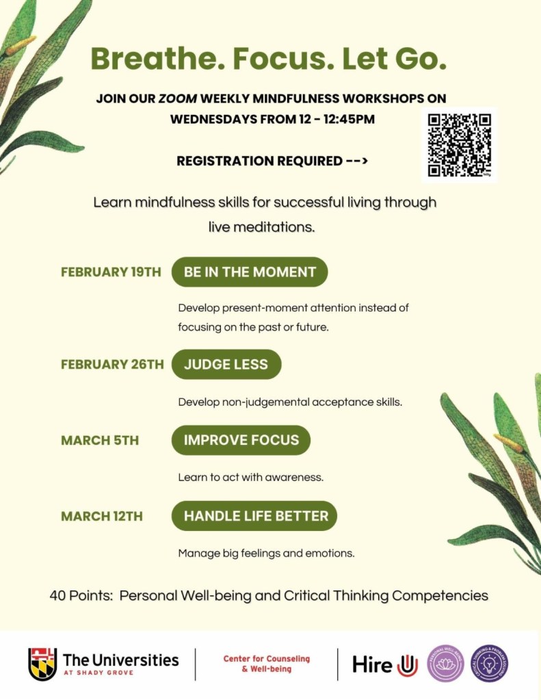 The USG’s weekly bulletin email shares workshops the counseling center hosts to help understand and participate in mindfulness as a valuable skill development for managing and reducing stress and anxiety, fostering productivity. In the workshop, you are told the benefits of mindfulness and participate in the practice, taking note of a reoccurring emotion. By practicing mindfulness, you can identify that reoccurring emotion accompanying stress and anxiety that may be stopping you from a clear headspace needed to be productive.